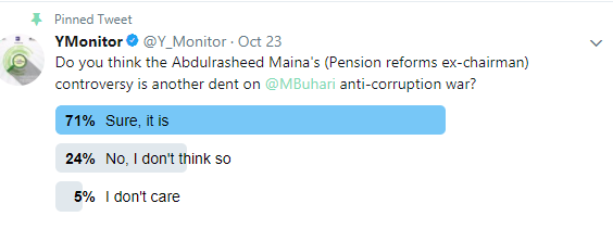 by YWriter More than seventy percent of our voters believe that the Abdulrasheed Maina’s scandal is another dent on President’s Buhari’s government. A meargre twenty percent […]