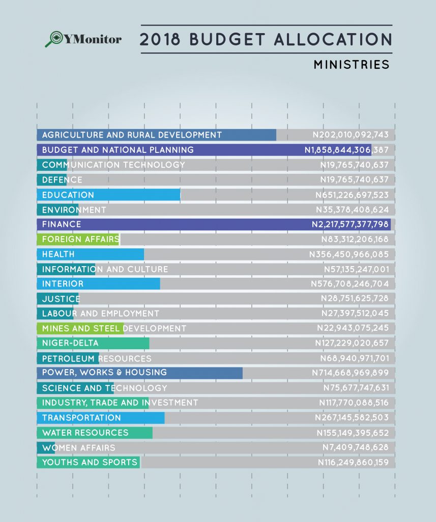 A look through the above info-graphics also show that the country is spending more on security, Ministry of Power, Works and Housing; these two ministries are perennial culprits, both Ministries in the previous years also had one of the highest budgetary allocations. Yet this annual increased budget spending has little or no impact on the lives of the people. Power has not fared better, with the power grid collapsing at various times in the course of the year, same applies to road infrastructure. In terms of security, the ministry of defence has not in anyway justified her humongous allocation as the security of lives and properties is completely non existent.