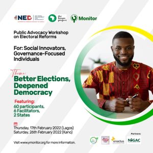 Through her YMonitor Accountability Project, the Future Project Africa is set to hold its maiden public advocacy workshop on electoral reforms on Thursday, February 17th in Lagos and Saturday, February 26th in Kano.